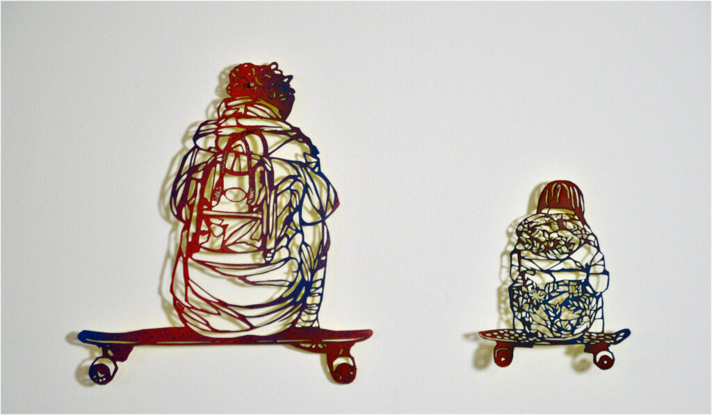Zum Geburtstag habe ich mir von meinen Gästen Privatfotos zur freien Bearbeitung gewünscht. Der Inhalt sollte etwas mit AUFBRUCH zu tun haben. Hier nun einige Ergebnisse. Je nach Ausgangsfoto habe ich mit verschiedenen Papieren experimentiert, mit mehreren Schichten gearbeitet und Papierschnitte als Sprüh-Schablonen eingesetzt. Das Skater-Motiv wurde als Scherenschnitt und Lasercut gearbeitet.
