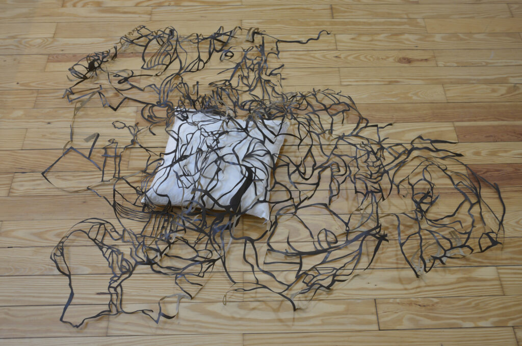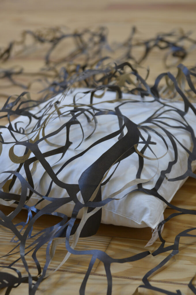 Bodenarbeit, 100 mal ca 160 cm, Scherenschnitt, Kraftpapier, Kissen.